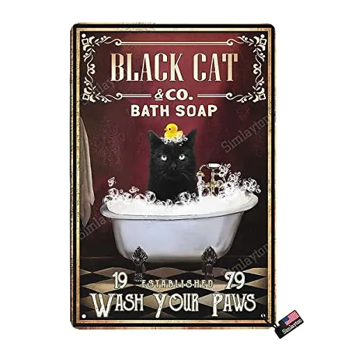 Wall Decor Tin Sign Funny Black Cat Pattern Bathroom Use Vintage Style